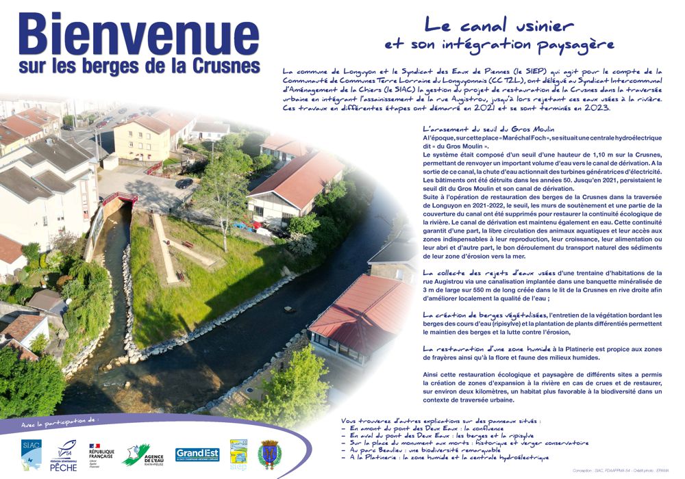 Dans un souci de restauration écologique et d’amélioration de la qualité de l’eau, le Syndicat Intercommunal d’Aménagement de la Chiers (SIAC porteur du projet), la commune de Longuyon et le Syndicat des Eaux de Piennes ont entrepris des travaux de réhabilitation entre 2021 et 2023. Ces actions ont permis de supprimer certains aménagements comme le seuil du Gros moulin et le mur de soutènement devenus obsolètes tout en maintenant le canal en eau, et d’intégrer un projet d’assainissement pour collecter les eaux usées d’une trentaine d’habitations par la création d’une berge minérale en rive droite.